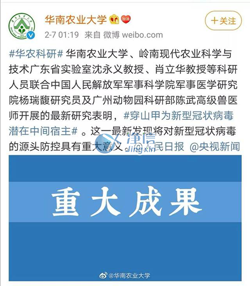 華南農(nóng)業(yè)大學(xué)的沈永義和肖立華對(duì)比了穿山甲和新型冠狀病毒感染者體內(nèi)的基因樣本,并結(jié)合其他研究結(jié)果,發(fā)現(xiàn)穿山甲可能是新型冠狀病毒的潛在來源。兩位研究人員在2月7日舉行的新聞發(fā)布會(huì)上表示,二者序列之間的相似度高達(dá)99%。
